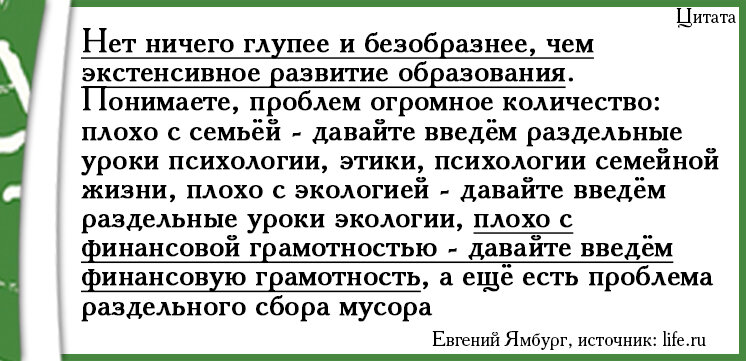 Здравствуйте, уважаемые читатели! ФГОСы нового поколения (у нас уже поколений столько нет, сколько ФГОСов 😁) озадачили школьную общественность. Уж очень много текста, который нужно проштудировать досконально, и явных проблем, которые замаячили на горизонте... Все это - очередные федеральные государственные образовательные стандарты. Даже сам Евгений Ямбург отрицательно высказался о новшестве, которое "узаконили" изменения в стандартах, а именно - официальное введение в школьную программу финансовой грамотности. Я отношусь к этой персоне неоднозначно! Ямбург всегда для меня был рупором чиновников и двигателем современных изменений в школьном образовании, но в этом случае он так резко отреагировал на появление у уроков финансовой грамотности официальной основы... Вот, что сказал заслуженный учитель России про это новшество: Конечно, экстенсивный путь характерен для экономики, но на настоящий момент в школьном образовании он главенствует! Действительно, друзья, в школе стараются раздуть