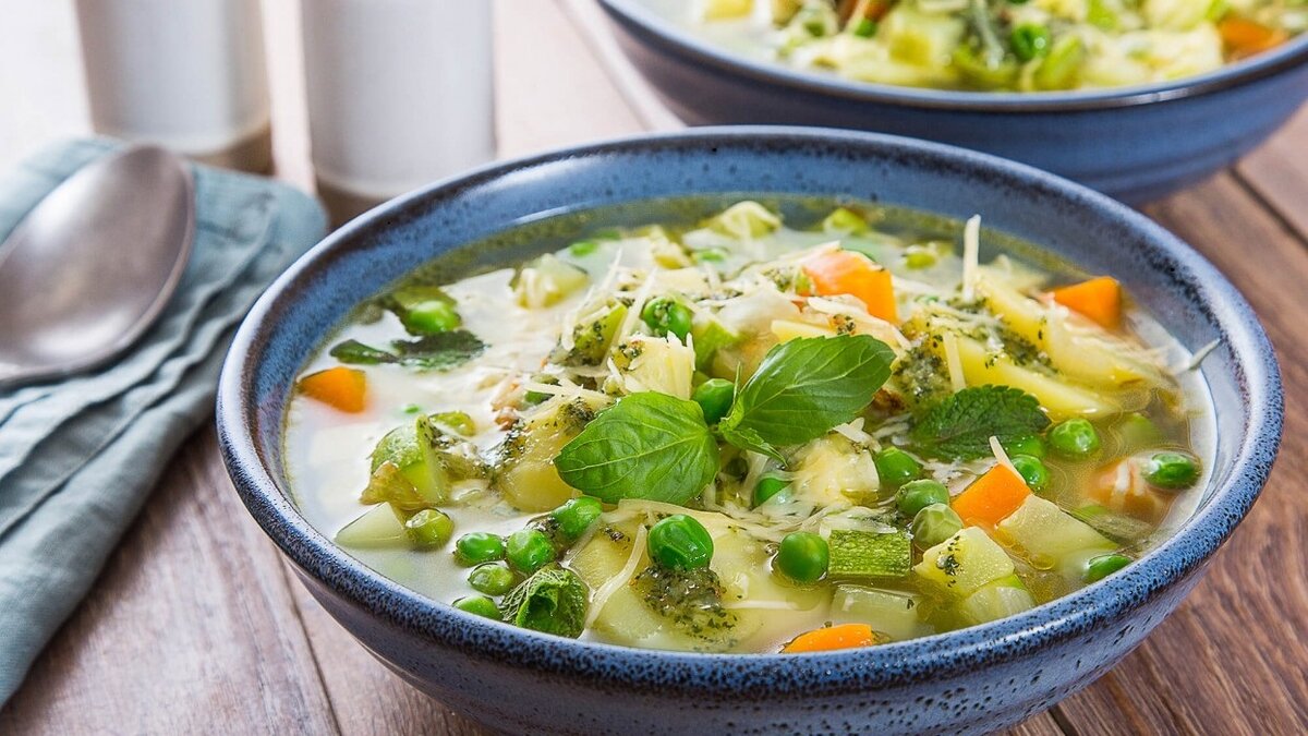 Продукты: Морковь 20 г, репа 20 г, лук репчатый 10 г, огурцы свежие 50 г, картофель 100 г, горошек зелёный 20 г, жир 10 г, листики шпината 10 г, зелень. Суп этот готовят преимущественно в зимнее или весеннее время, когда огурцы поступают из теплиц. Морковь, репу и лук нарезать ломтиками и слегка спассеровать с жиром. Свежие тепличные огурцы вымыть и нарезать кружками, более крупные разрезать вдоль, картофель нарезать ломтиками. В горячий бульон положить коренья, а через несколько минут варки добавить картофель. За 5–6 минут до окончания варки положить огурцы, горошек и суп довести до вкуса. Отпускать суп со сметаной и зеленью. Приятного аппетита.