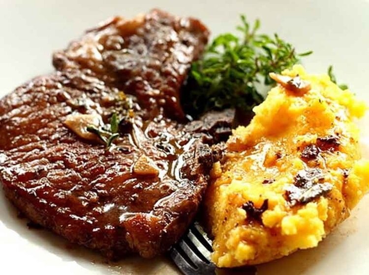 Ингредиенты: 50 г сливочного масла или маргарина, 1 кг свинины, 1 луковица (мелко нарезать), 1 лавровый лист, зубчик чеснока, 100 мл красного вина, 1 кг помидоров без кожицы (нарезать), 1 бульонный кубик, 1 кг картофеля, соль, перец, 250 мл оливкового масла, 2 ст. ложки крупно нарезанной петрушки. Приготовление: обжарить свинину. Вынуть мясо и здесь же обжарить лук с лавровым листом, добавить чеснок, красное вино. Довести до кипения, дать наполовину увариться. Положить помидоры, бульонный кубик и влить 100 мл воды. Довести до кипения и положить свинину в соус. Поставить кастрюлю в духовку и тушить около 1 ч. Отварить картофель, сделать густое пюре, добавляя понемногу оливковое масло. Посолить, поперчить. Нарезать свинину ломтиками и подавать с пюре, посыпав петрушкой. Приятного аппетита.