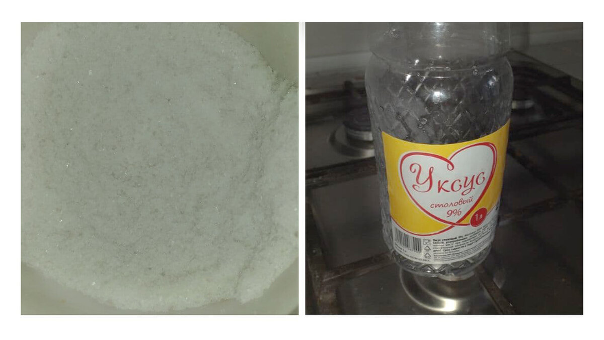 Всю соль пропитываю столовым уксусом (использовала 9% столовый). Оставляю нагар раскисать на 5-10 минут.