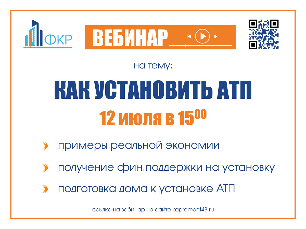 ФКР Липецкой области совместно с экспертами Всемирного банка организует проведение вебинара «Как установить АТП», который состоится 12 июля в 15:00. Своей целью вебинар ставит повышение информированности граждан и организаций, участвующих в оформлении заявки на софинансирование энергоэффективного капитального ремонта. ⠀ Вебинар рассчитан на активных жителей многоквартирных домов, представителей управляющих компаний, а также всех желающих. Содействие в организации вебинара оказал Департамент развития территорий, пригласив активных собственников по каждому округу. Вопросы в рамках вебинара: примеры реальной экономии получение финансовой поддержки на установку подготовка дома к установке АТП⠀⠀ Чтобы принять участие в вебинаре, просто перейдите по ссылке на QR-коде к данной публикации. Докладчиками выступят специалист по организационным вопросам программы Всемирного банка «Повышение энергоэффективности жилищного сектора в Российской Федерации» Константин Шишка, технический эксперт Пр