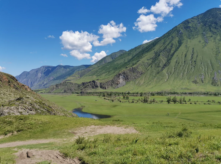 Спустя полтора часа хода по озеру (прикиньте какое оно громадное в длину) мы причалили к суше - долине реки Чулышман. Договоренность с местными сводилась к тому, что нас посадили в новую (!) Газель и на всех скростях повезли по у