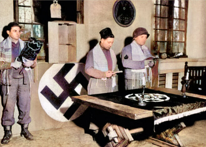 Чем больше времени проходит с момента окончания Второй мировой войны, тем популярнее это фото становится на разного рода антисемитских сайтах. Что мы тут видим? - злорадствуют юдофобы. Налицо документальное доказательство того, как евреи прислуживают нацистам. Вот вам вся необходимая символика, вот свиток Торы в руках у одного из предателей, вот двое других читают какую-то неведомую молитву, наверняка благославляя Гитлера на любые бесчинства, включая Холокост...