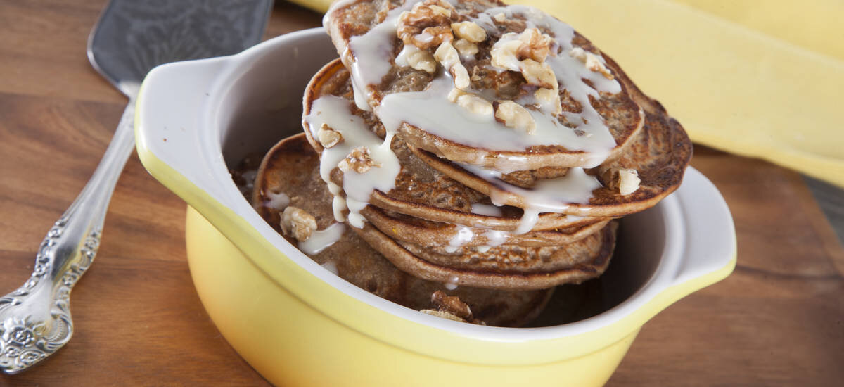 Готовые оладьи посыпьте рублеными орехами, к ним можно подать несколько топпингов: сгущёнку, варенье, сметану или финиковый сироп. Приятного аппетита!