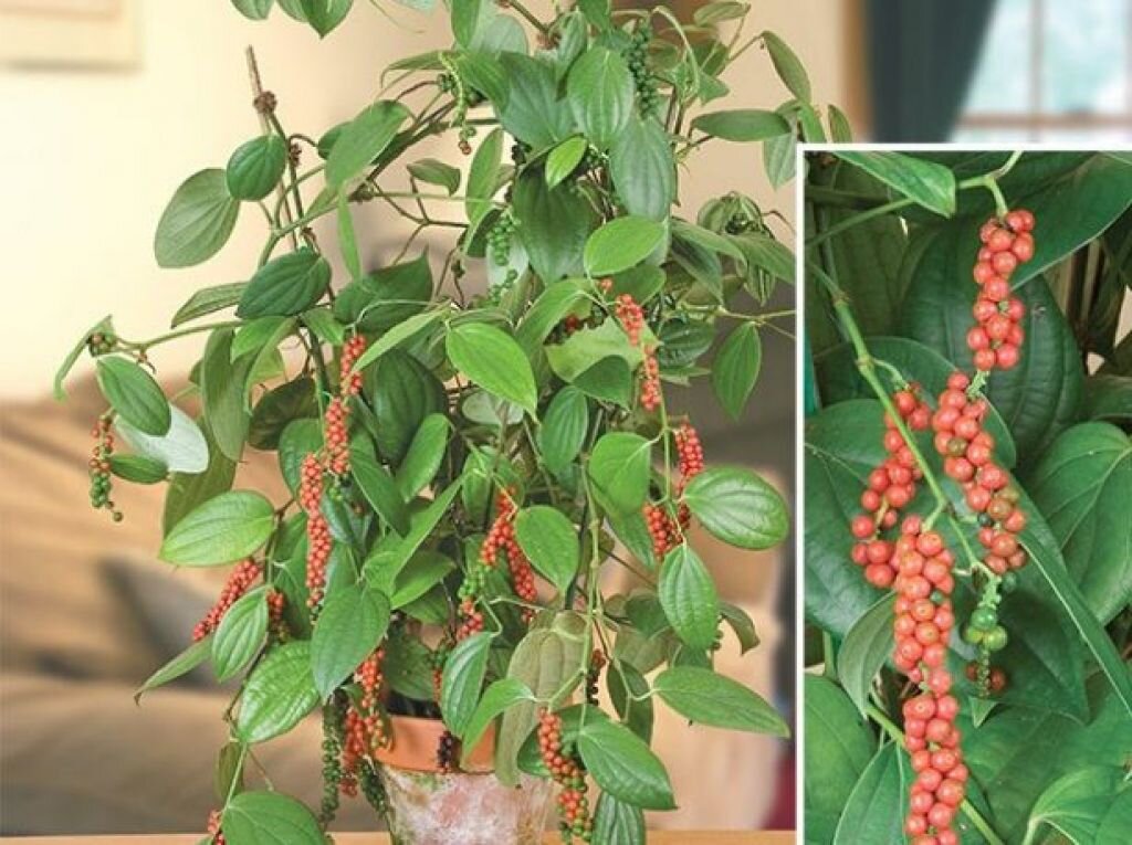 Чёрный перец, или душистый – ботаники называют его «Piper nigrum» - растение, типичное для Южной Индии. В природе живёт в низинах или влажных жарких тропиках. Однако в силу своей относительной неприхотливости легко приживается в условиях городских квартир, если владелец старается придерживаться некоторых основных правил ухода. Цветы и плоды Внешний вид цветов в самом вначале цветения немного необычен, чаще их принимают за зелёные плоды, и даже пытаются собирать, но это не так: грозди «зелёных узелков» - не что иное, как едва начавшие формироваться соцветия. Внешне оно выглядит как миниатюрная кисть винограда. Позже из «узелков» бутонов появляются первые цветы, а при созревании плоды сначала розовеют, затем становятся красными. Красный цвет и означает, что «урожай» чёрного перца пора собирать. Чёрный перец в домашних условиях Из «Piper nigrum» получается отличное комнатное растение. Оно требует умеренного освещения, поэтому восточные окна прекрасно подойдут для комфортного п