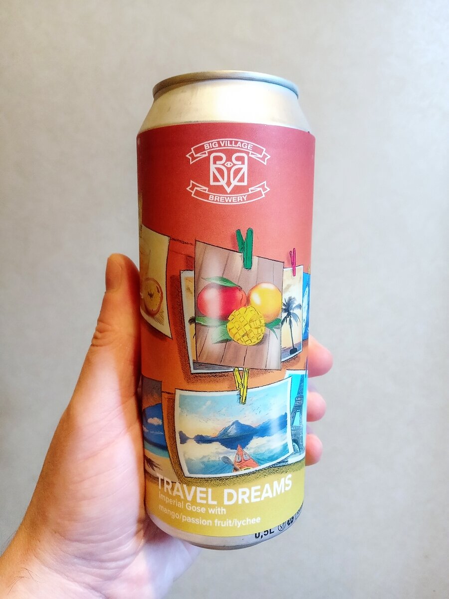 Собственно, в наше время о них только и остается, что мечтать... Так что помечтаем под пиво Travel Dreams от краснодарской пивоварни Big Village Brewery. Пиво заявлено как фруктовый гозе, т.е. кисляк. Кстати, знакомство с этой пивоварней у меня началось тоже с кисляка, но как-то не задалось, поскольку, судя по всему, мне попалось пиво из какой-то неудачной партии. Посмотрим, что будет на этот раз. Пивовары описывают свое пиво следующим образом: Усиленный мультивитаминно-изотонический Гозе сброженный по технологии sour fermentation нашим домашним лактоблендом и заполненный до краёв плодами манго, маракуйи и личи. Набор фруктов довольно стандартный для кисляка, так что ожидать каких-то откровений не стоит, как мне кажется. Впрочем, проверим. ТТХ: Алкоголь - 7% Плотность - 18% Горечь - ??? Хмель - ??? Пиво желто-оранжевого оттенка, мутное, непрозрачное. Пены нет совсем. Аромат довольно слабый - явно чувствуется только маракуйя. Во вкусе все заявленные фрукты смешаны равномерно - никто н