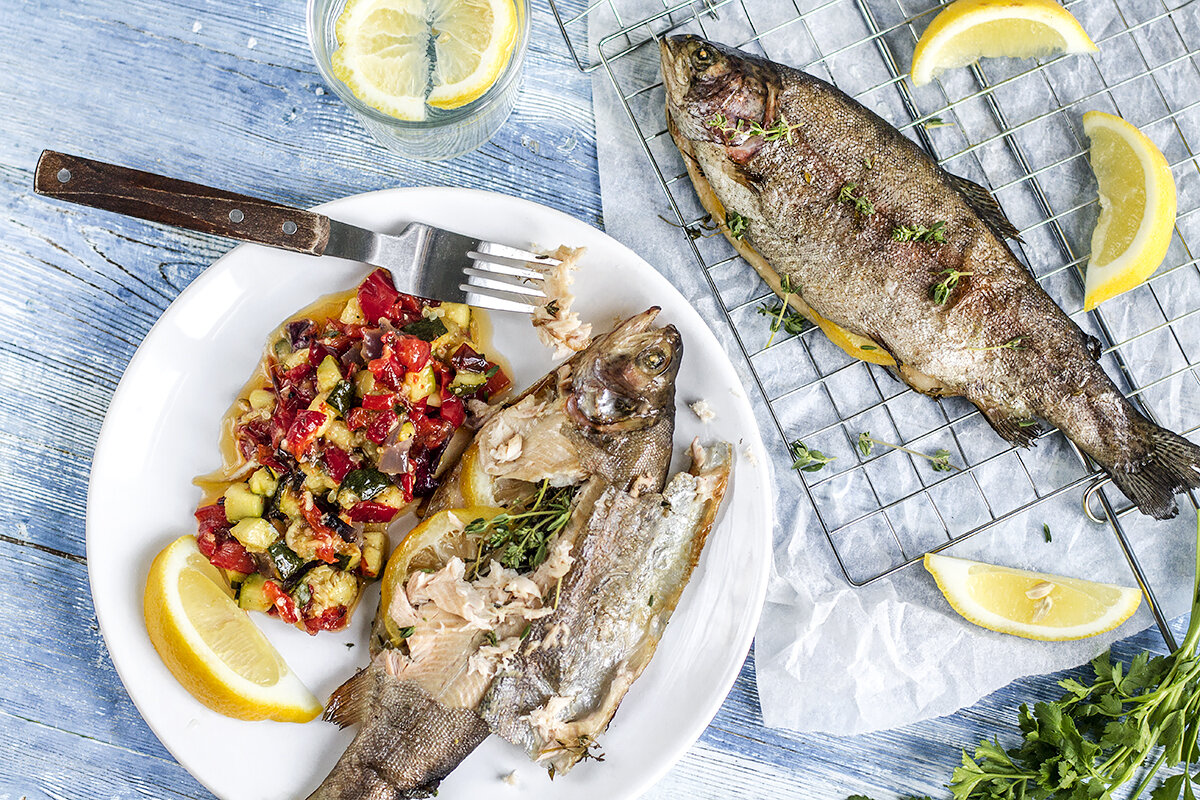 Радужная форель получила своё название благодаря удивительной возможности подстраивать окрас под цвета окружающей среды. Но знаете, где эта рыбка точно не затеряется? На вашем столе! Особенно в сочетании с яркой сальсой из овощей. Простое в исполнении, но очень ароматное и вкусное блюдо — радужная форель на гриле с сальсой из печёных овощей. Для любителей рыбы этот рецепт может стать незаменимой частью не только застолий, но и ежедневного рациона. Подойдет он и тем, кто предпочитает легкую, но питательную пищу. Калорийность блюда всего 71,53 ккал на 100 граммов! Для приготовления радужной форели на гриле с сальсой из печёных овощей нам понадобится: Время приготовления 30-35 мин. + 10 мин. на подготовку. Приступаем к готовке: Блюдо также можно приготовить дома. Разогрейте духовку до 200 гр. Переложите рыбу, начиненную лимоном и тимьяном на противень. Посолите, поперчите и запекайте 15-20 мин. при температуре 200 гр. Овощи нарежьте, как написано в пункте № 2. Переложите на другой противе
