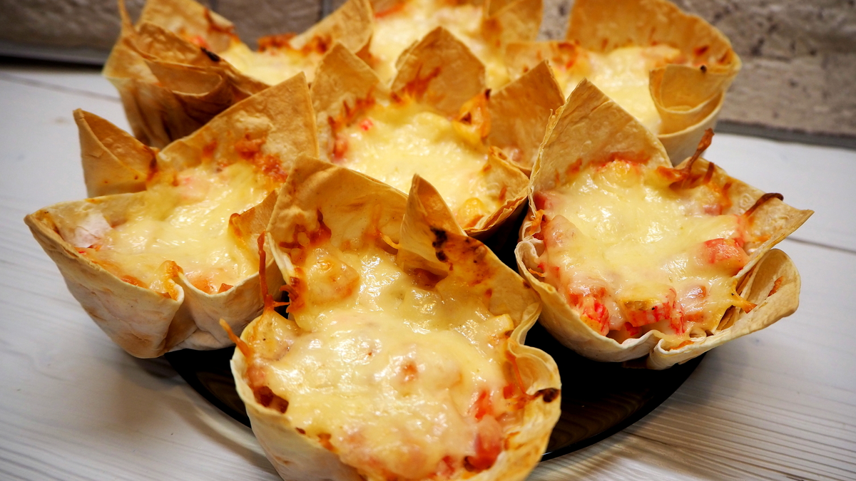 Выкладываем лаваш в форму для маффинов и раскладываем начинку.