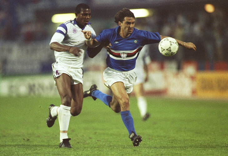 «Сампдория» тоже собрала мини-дримтим – с Пальюкой в воротах, Верховодом в защите, Тониньо Серезо в опорной зоне и Аттилио Ломбардо на правом фланге. Но главным украшением была атака. В штрафной расстреливал Джанлука Виалли, форвард с телосложением боксера-полутяжа и координацией китайского акробата. Рядом творил Манчини.