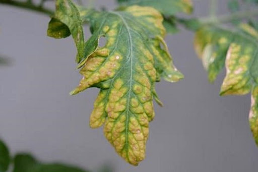 Иногда у помидоров листья, расположенные в верхней части куста, начинают желтеть, а нижние по-прежнему остаются зелёными. Дело здесь не в погрешностях с поливом, как может показаться на первый взгляд, а в дефиците тех или иных элементов питания. Подобное явление, например, с успехом может быть спровоцировано недостатком серы. Процесс начинается с покраснения жилок, с одревеснения и истончения стеблей, а заканчивается указанным пожелтением. Исправить ситуацию может обработка помидоров раствором сульфата магния, взятого из расчёта 10 г на 10 л воды. Недостаток в почве железа также отражается на верхних листьях. В этом случае в центре листовых пластин и вдоль средних жилок образуются хорошо заметные зоны, окрашенные в жёлтый цвет. Чтобы придать растениям здоровый вид, их следует опрыснуть 1%-ным раствором железного купороса. Симптомы, похожие на недостаток железа, могут появиться и при нехватке марганца с той лишь разницей, что окраска жилок в этом случае примет жёлто-зелёный оттенок. Для