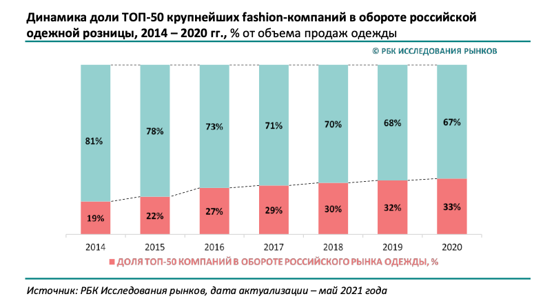 Тренд на консолидацию российского одежного рынка вокруг крупнейших игроков наблюдается на протяжении последних 7 лет. Результаты исследования «Одежный ретейл 2021» позволяют говорить о том, что данный тренд не прервался и в 2020 году, когда рынок столкнулся с последствиями пандемии коронавируса. Так, если в 2014 году на долю 50 крупнейших компаний приходилось 19% оборота российского рынка одежды, то в 2020 году их доля выросла до 33%. В прошлом, наибольшее влияние на данный тренд оказал кризис 2014-2015 годов, когда крупнейшие игроки продолжали демонстрировать рост продаж на фоне значительного падения среди других компаний. Устойчивость крупного бизнеса объясняется большими финансовыми ресурсами, которые позволяют компаниям смягчать последствия кризисных явлений, а также совершать инвестиции в развитие бизнеса. За последний год доля крупнейших компаний в объеме продаж одежды увеличилась на 1%. Выросло и расслоение внутри группы лидеров: если в 2019 году на первую десятку приходилось 1
