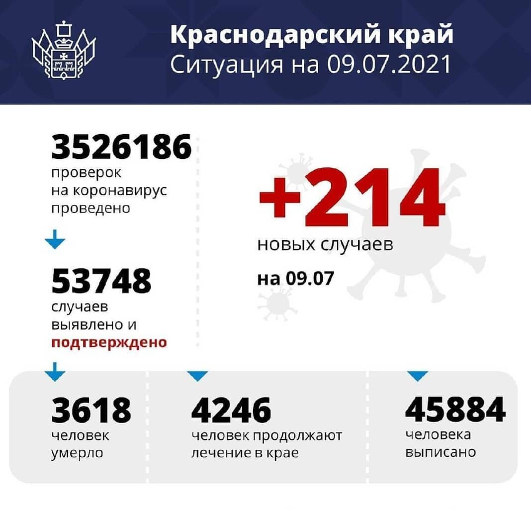 В Краснодарском крае за сутки зафиксировали 214 случаев коронавируса