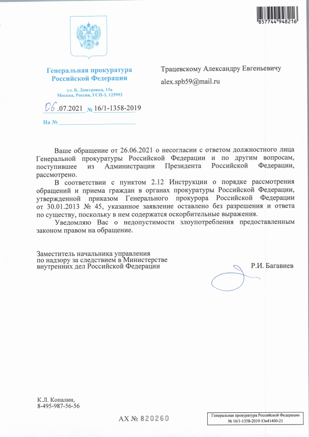 ВОТ ТАК ОНА «ОСКОРБЛЕННАЯ» ГЕН. ПРОКУРАТУРА ПРИКРЫВАЕТ СВОЕ СОБСТВЕННОЕ, ОСОЗНАННОЕ БЕЗДЕЙСТВИЕ НА ПРОТЯЖЕНИИ ДВАДЦАТИ ОДНОГО ГОДА!!! РУКАМИ НЕОДНОКРАТНО УПОМИНАЕМОГО МНОЙ ЗАМ. НАЧАЛЬНИКА УПРАВЛЕНИЯ ПО СОКРЫТИЮ ПРЕСТУПЛЕНИЙ В МВД ГОСПОДИНА Р.И.БАГАВИЕВА , В ИСПОЛНЕНИИ НЕКОЕГО ОЧЕРЕДНОГО, НОВОГО ПЕРСОНАЖА, ПИСАРЧУКА К.Л.КОПАЛИНА В ТЕЧЕНИИ КОТОРЫХ ОНИ ПОКРЫВАЮТ ПРЕЖДЕ ВСЕГО МПГ ПО ТОРГОВЛЕ ЛЮДЬМИ ЯБЛОКОВА И.Б., ЛЖЕКРЕДИТОРОВ И ВОРОВ ВСЕГО НАШЕГО ИМУЩЕСТВА ПОДОНКОВ ИЗ ЗАО «РИК» -ТАРЛЕР Е.Л….ЛЖЕДОВЕРЕННОГО ОТ ИХ ИМЕНИ ЛИЦА, ОРУДОВАВШЕЙ ПО ПОДДЕЛЬНОЙ ДОВЕРЕННОСТИ ГОСПОЖИ МАРКОВОЙ В ПРОДАЖНОМ СУДЕ ВЫБОРГСКОГО Р-НА СПб В 2005г, Т.Е. ЧЕТЫРЕ ГОДА СПУСТЯ!!! ПОСЛЕ ПОДАЧИ НАШЕЙ СЕМЬЕЙ ИСКОВОГО ЗАЯВЛЕНИЯ В ЭТОТ СУД, ГДЕ ОНО ОКАЗАЛОСЬ В ЛАПАХ КОРРУМПИРОВАННОЙ СУДЬИ КОЛОМИЕЦ О.Л.!!! НИ ОДИН ИЗ ЭТИХ ФАКТОВ ТАК И НЕ БЫЛ ПРОВЕРЕН НИ МВД, НИ ПРОКУРАТУРОЙ ЗА ВСЕ ГОДЫ!!! ПОДОБНЫЙ БЕСПРЕДЕЛ ВСЕ ДВАДЦАТЬ ОДИН ГОД ТВОРИТСЯ СО СТОРОНЫ ГУ МВД ПО СПБ и ЛО , В Т.Ч. СО СТОРОНЫ ЗАМ. НАЧАЛЬНИКА ГСУ МВД УСТЮЖАНИНА М
