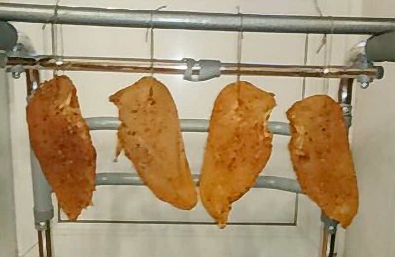 Захотелось соляночки (суп). Пошел на рынок, все купил, в том числе вяленую куриную грудку и посетила меня интересная мысль. (Бывает иногда. ;) ) Зачем её покупать? Цена как у чугунного моста, а ведь можно приготовить самому! Дешевле и знаешь из чего и кто ее сделал. Ингредиенты: Грудка куриная (без кожи и костей) — 4 шт. Соль (крупная) — 3 ст. л. Водка (+ 50 в себя) — 150 мл. Паприка сладкая — 2 ст. л. Перец красный жгучий — 1 ч. л. Сахар — 1 ч. л. Приправа (прованские травы) — 1 ст. л. 01. Не настаиваю, но последовательность действий должна быть именно такой. Мокрыми руками насыпать специи не очень приятно, даже если и ложкой. Сам проверял.;)))))