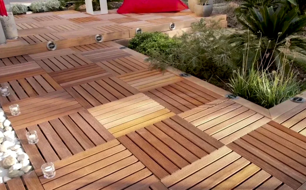В отличие от террасной доски, которая нуждается в профессиональном монтаже на лаги, требующем компенсации теплового расширения, а также выбора метизов с учетом свойств полимера (ПЭ — пластичный, а ПВХ и ПП — жесткий, но хрупкий), работа с паркетом предельно проста: нужно всего лишь защелкнуть замки, предусмотренные на подложке модулей. Укладывают материал на твердое основание — уплотненный грунт, утрамбованную отсыпку из мелкого гравия или щебня, слой бетона, асфальт, старую тротуарную плитку и даже газон. Причем небольшой рельеф в виде плавных перепадов высоты делу не мешает. Чтобы улучшить дренаж, под покрытие настилают гидроизоляционную пленку или специальные подкладочные листы из 3-миллиметровой резины. Кроме того, по краям настила следует сделать водоотводные канавки.