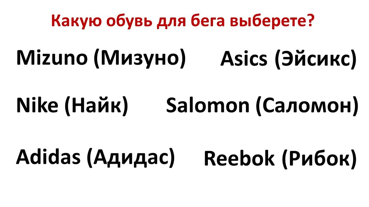 #лингвистическиеигры Давайте попробуем в этот раз выбрать бренд обуви для бега. От души, не особенно задумываясь, какому бренду, из представленных на изображении, вы бы доверили свои ноги?) Комментарии лучше читать после своего ответа) Результат игры будет отдельным постом.