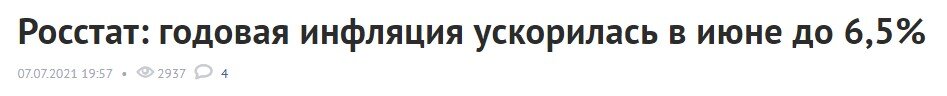 По итогам июня 2021 года рост инфляции в годовом выражении обновил 5-летний максимум. По данным Росстата, потребительские цены в июне 2021 года выросли в сравнении с июнем 2020 года на 6,5%. В сравнении с предыдущим месяцем - на 0,66%. В последний раз показатель выше этого был зафиксирован в августе 2016 года (6,9%). Что тут сказать... С одной стороны, в этом показателе, конечно, имеет значение т.н. низкая база. Июнь 2020 года был месяцем, когда люди только начали выходить из самоизоляции, спрос на товары и услуги был очень низким, существенно ниже, чем до пандемии, и потому цены росли не так сильно, как в предыдущие и последующие месяцы. Основное подорожание пришлось на март-апрель (начало кризиса, обвал рынков) и уже последние месяцы 2020 года, а также первые месяцы 2021 года (после сильного обесценивания рубля). Поэтому сравнение июня с июнем и дало вот такой рекордный результат. По последнему прогнозу (а он ухудшился) инфляция в России по итогам 2021 года составит 5%. Но с другой с