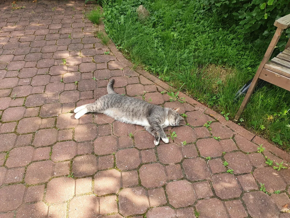 Жара... Просто невыносимо находиться на улице. С самого раннего утра уже парилка. Несчастная наша Маруся изнывает от жары на улице, ищет укромные уголки. В её части дома (прихожей) вообще сауна. Домой её не пустить, будет бойня. Да она и сама шарахается иной раз с рычанием от двери, в комнаты особенно завидев там любопытствующие носы. Но невыносимо смотреть на её мучения. В итоге решили оттащить Марусю на цокольный этаж, где у нас "постирочная комната" (техническое помещение). Там хотя бы не жарко, а по температуре очень комфортно. Непривычная к новой обстановке, Марусе требовала выпустить её на улицу. Мяукала, не находя себе место. Ещё бы всё новое, незнакомое, никаких её запахов тут нет. Но потом смирилась: попила водички и даже устроилась на своей лежанке. Наверное, ей самой полегчало, что жара закончилась. А вообще жалко очень тех, кто вынужден по улицам бродить и даже в теньке не находить прохладу. Я как-то писала, что к нам наведывается чёрный котик, очень похожий на такую