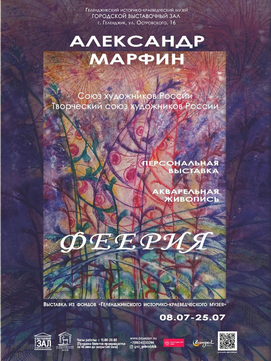 🖼 Так называется персональная выставка геленджикского художника Александра Марфина. . 🖼 Произведения, выполненные на тонкой рисовой бумаге в технике мокрой акварели, автор представит 12 июля в городском выставочном зале Геленджика. . 🖼 По мнению самого Александра Марфина, в каждом произведении должна быть какая-то недосказанность или загадка, которую должен разгадать для себя зритель. Всем любителям искусства предстоит понять, какую неоконченную мысль оставил в ярких карнавальных своих работах художник. . 🖼 В создании всех произведений Марфина присутствует интуиция, которая ведет его в мир пластического пространства гармонии. Он старается передать эстетичность пластики, переходящую в поэтическую гармонию цвета и линии. . 🖼 «Хочется показать легкость, словно зимние узоры на стекле, такие совершенные, где нет ничего лишнего, как будто выполнены на одном дыхании», - отметил автор выставки. . 🖼 «Феерия» будет открыта для посещения с 11.00 до 20.00, с 12 до 25 июля по адре