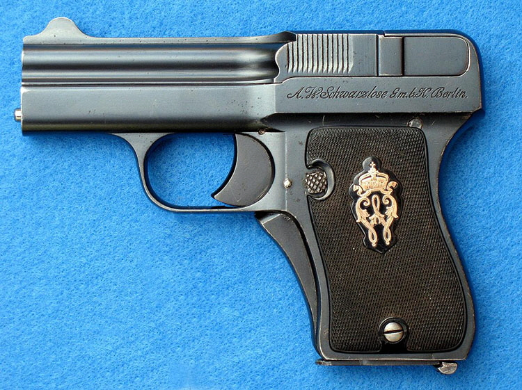 Этот пистолет интересен и сам по себе даже независимо от того, что экземпляр с серийным номером 1 (на фото выше) стал в свое время личным оружием последнего императора Германии, Вильгельма Второго. Ибо это и часть истории столь любезных автору немецких "жилетников" и "компактов" начала XX века, и любопытная конструкция со "свободным затвором наоборот", где не затвор откатывался назад при выстреле, а ствол - вперед.