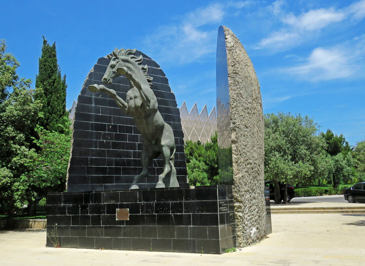 От Сальянских казарм, этого русского квартала Баку, можно спуститься на Тбилисский проспект, начало которого отмечено памятником азербайджано-грузинской дружбе "Энергия возрождения" (1998). Над ним высится Спортивно-концертный комплекс имени Гейдара Алиева, советский стадион (1977-90), капитально реконструированный к Евроиграм-2015: Больше самого стадиона, впрочем, впечатляет подземный переход близ него, не единственный в Баку интересно оформленный: Отсюда я спустился на мощную улицу Бакиханова (когда-то - Нижне-Бульварную), которую можно в принципе считать границей исторического центра - к югу от неё заканчивались Кубинка и Шемахинка, бедняцкие предместья по разные стороны дороги к этим двум городкам. Друг напротив друга расположились российское посольство: И бывшая Володарка - то есть, швейная фабрика имени Володарского, в которую в 1934 году были сведены многочисленные мастерские да артели. Впрочем, этот корпус явно дореволюционный (ну или, наоборот, новодельный), так что