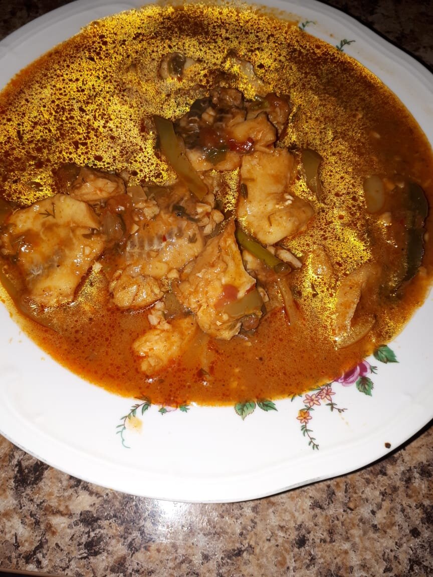 Один из моих любимых рецептов. 1. Готовим соус. В глубокую сковороду наливаем 1-2 ст.ложки оливкового масла+1 шт.репчатого лука, слегка спассеровать. 3-4 помидора нарезать кубиками и соединить с луком, тушить около 10 мин. Болгарский перец нарезать крупной соломкой и также добавить в сковороду. 2. Теперь кладём специи: соль, перец, острую аджику, паприку, сок лимона, чеснок (8-10 зубчиков). Тушим 1-2 мин. 3. Кладём 3-4 ст.ложки томатной пасты и 1 стакан горячей воды. Продолжаем тушить на медленном огне. 4. Филе трески или минтая режем порционными кусочками и погружаем в этот соус на 20 мин. Добавить большой пучок кинзы за 2 мин. до готовности. Блюдо получается очень ароматным и вкусным!