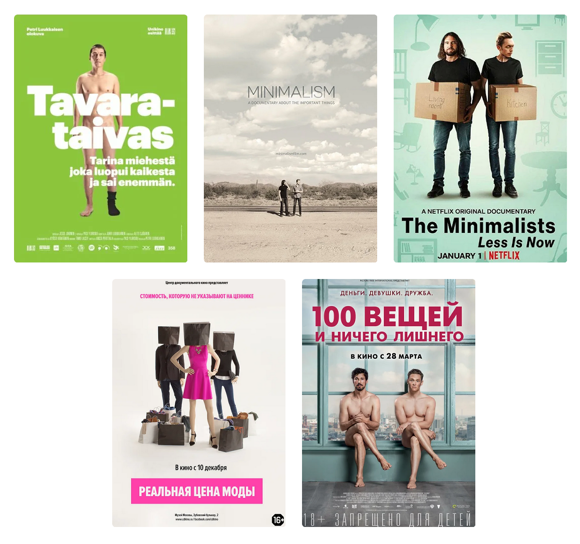 Что посмотреть по тематике моего блога? Мой топ фильмов c кратким описанием о осознанном потреблении, минимализме и психологии покупок. Фильмы, которые изменят твой взгляд на вещи: 🎬 Мои вещи | Tavarataivas Финский чувак решил сделать челленж: Перевести все вещи в гараж, вообще все, даже трусы. Разрешено брать одну вещь из гаража в сутки. 🎬 Минимализм. Документальный фильм о важных вещах | Minimalism: A Documentary About the Important Things Два успешных парня устали от потреблудства. Бросили работы и организовали свой сайт и подкаст «The Minimalists». Через пару лет у их философии появились миллионы фанатов по всему миру. 🎬 Минимализм. Сейчас — время меньшего | The Minimalists: Less Is Now Второй фильм о предыдущих двух парнях минималистах и их движении «The Minimalists» спустя 6 лет. Теперь под брендом Netflix. 🎬 Реальная цена моды | The True Cost О том, как каждый сезон нам пытаются продавать. Как потреблудство сказывается на окружающей среде. И пустеют кошельки. 🎬