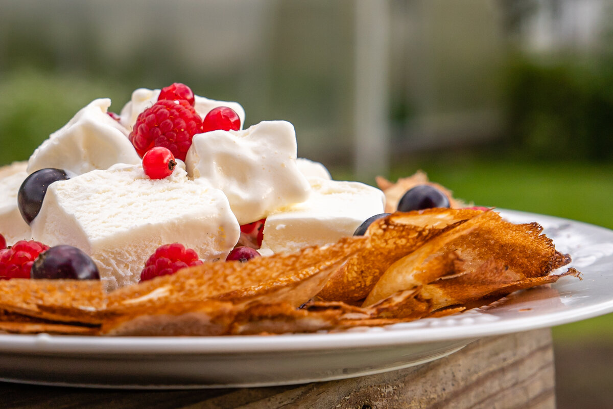 На Подмосковье пала тридцатиградусная жара. Морозилка пополняется мороженым снова и снова, а дети отказываются от супа. Что же, сделаем легкий и свежий десерт - квинтэссенцию лета! Хрустящие крахмальные блинчики отлично подойдут к сливочному мороженому и ягодам из своего сада. Для теста: