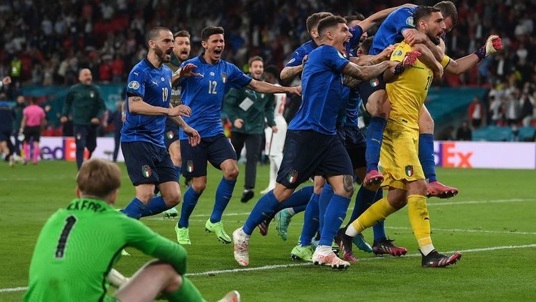 Так как стадион был англичан,ожидал что именно они начнут бодрее чем итальянцы. И так произошло. 1-тайм. Первый тайм был полностью за Англией На 2-й минуте последовал гол,мы его разберём Англия забила с после того,как на их половине разыгрывали угловой,игроки Италии не успели за быстрым передвижением мяча на свою треть. Тут важно отметить движение Кейна,который посмотрел свободные позиции для дальнейшей доставки. Далее подключения Люка Шоу В целом тут ситуация такая: Кьеллини вышел на Трипьера и Киран навесил. Так как в этом матче было действительно много внимания на Кейна,то Барелла и Ди Лоренцо взяли его вдвоем,оставив игрока на фланге Англия. 3-4-3 с двумя опорниками Англия играла с двумя опорниками это Райс и Филлипс. Таким способом они придерживали активность среднего блока Италии В обороне все куда проще,5-3-2 с упором на средний блок Италии Италия. Первый тайм Италии можно описать как безыдейности в атаке. Иммобиле никак не вписался под игру с Англией. Активность Кьезы и