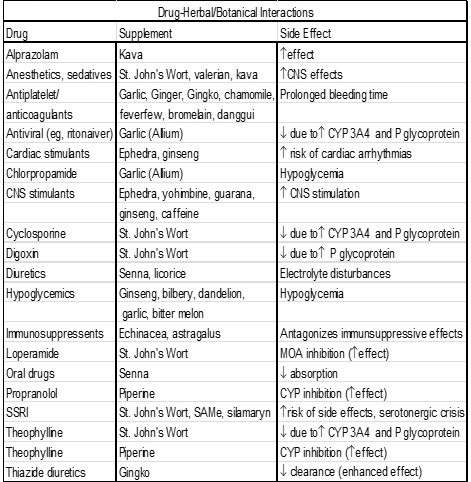 Среди наиболее часто определяемых взаимодействий лекарство - питательное вещество (питательное вещество или добавка), которые изменяют фармакокинетику лекарства, находятся взаимодействия, отражающие метаболизм лекарственного средства, в частности CYP3A4. Известно, что некоторые питательные добавки взаимодействуют с лекарственными средствами. Они включают в себя, в том числе, зверобой (индуцирование CYP3A4, в особенности в кишечнике), эхинацею (индуцирование и ингибирование CYP в кишечнике), гинко билобу (индуцирование CYP219A) и грейпфрут (ингибирование CYP3A4 и ингибирование P-gp).