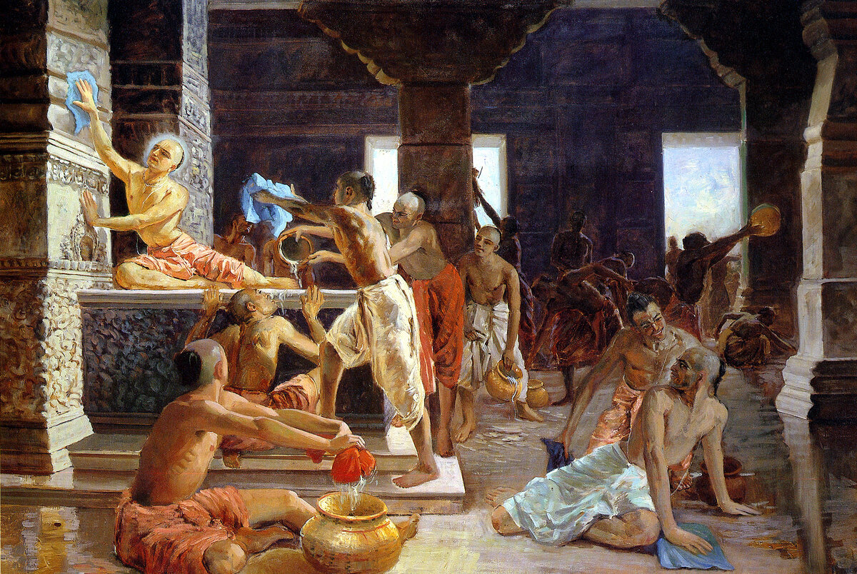 Сначала Он омыл водой главное помещение: стены, потолок, пол и скамьи для почетных гостей, пока не дошел, наконец, до симхасаны Господа Джаганнатхи. Гауранга все делал Сам, преданные только носили Ему воду. Воды требовалось так много, что все были заняты делом. В суматохе уборки кто-то незаметно лил воду на руки Шри Чайтанье, другие тоже, стараясь остаться незамеченными, лили воду Ему на лотосные стопы. Когда вода эта стекала с Его лотосных рук или стоп, ее тут же кто-нибудь украдкой собирал и выпивал. Но стоило кому-нибудь взмолиться поделиться милостью, как счастливец отдавал все, что у него оставалось в ладонях.