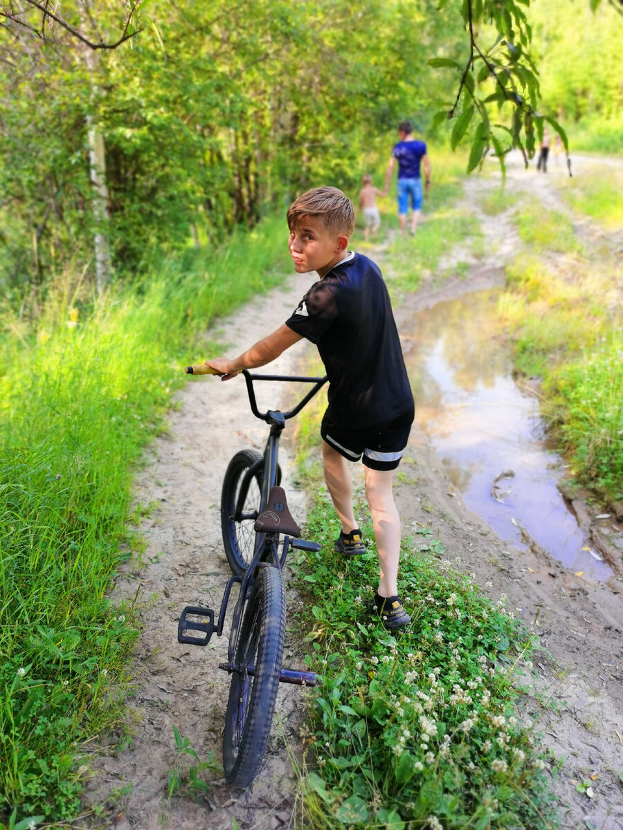 Позвонил Трофим отцу и сказал, что на речку хочется купаться, а без взрослых туда сейчас не пускают. Патрули ходят, потом штрафуют родителей, если детей одних "найдут"... Причём не меня позвал, а именно его. Заскучал видать. Папа там что-то пробурчал недовольно, что ему некогда и трактор сломался, но через час все же прикатил домой и сказал всем купаться собираться. Пацаны были в восторге. Я не очень, мне было жарко и нести свою тушку не накормленную шаурмой на корм мошкам мне не очень-то и хотелось. Но пошла, куда ж деваться. Итак летом общие выходы — редкость. Старшие на велосипедах. Мы ножками. Старшие, естественно, прикатили вперёд. Но не раздеваются. Отца ждут. Видно, что хотят его подонимать(побороться), но не знают настроя. Вдруг устал сильно. Мы пришли. Малышня переоделись и понеслись к реке. Папа потянулся, посмотрел на старших, что те сидят в ожидании, подначивают: "Не догонишь, не догонишь!" И не разочаровал... Дал Трофиму хорошую подсечку... Тот удержался... И понесл
