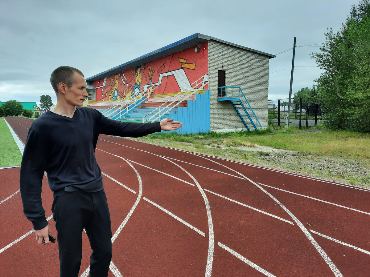 На фото: ведущий специалист по физической культуре и спорту администрации Парабельского района Сергей Новосельцев показывает, где на центральном стадионе будут расположены спортивная площадка для сдачи нормативов ГТО и уличные тренажёры.