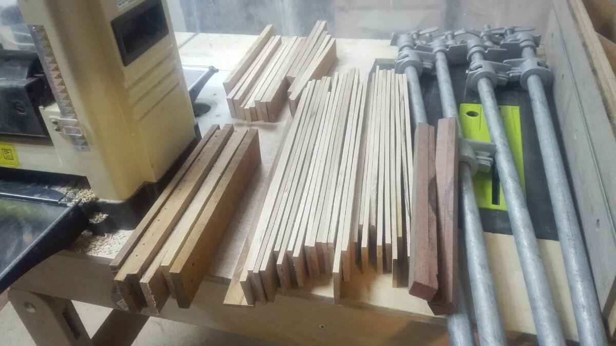 Одно время (перед отъездом из города в деревню) я увлекся торцевыми разделочными досками. Так как денег тогда было не сильно богато, а доски я делал в подарок друзьям "на память", материал для них я не покупал. В качестве материала выступали разобранные ящики из-под фруктов, которые (как я с удивлением узнал) нередко делают из бука. Вот я и насобирал этих ящиков, разобрал их на части, добавил немного бубинго (можно любую другую контрастную древесину, как вариант - дубовые паркет), который прислал мне мой товарищ Радик по почте. Из инструмента для работы потребуется Так как фуганка тогда у меня не было, то строгал заготовки я рейсмусом (на фото то самое бубинго). Точно так же прострогал, и, заодно, откалибровал по толщине и остальные заготовки. На циркулярке распустил ламельки от ящичков (опилил края и вдоль), потом на торцовке поотрезал в единый размер, заодно поспиливав отверстия от гвоздей. (торцовка так же инструмент не обязательный - эту манипуляцию можно сделать любой другой пилой