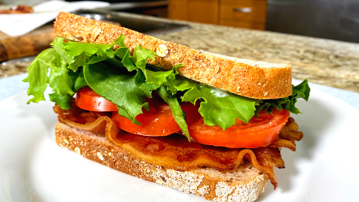 Сегодня приготовлю и поделюсь с Вами рецептом самого знаменитого бутерброда Америки. Я сам очень люблю приготовить бутерброд, с черным хлебом, салом и лучком. Как же я был удивлен, когда впервые увидел этот бутерброд в столовой в Америке. Этот бутерброд занимает лидирующее место среди всех бутербродов, появился он в начале 20 века. Этот вкусный и простой бутерброд состоит из хлеба и трех основных ингредиентов: бекон, салатные листья и помидоры. Разновидностей этого бутерброда существует очень много, сегодня я поделюсь с Вами своим простым и быстрым вариантом, в котором будет несколько интересных моментов. Ингредиенты: Пошаговый рецепт: 1. Выкладываю бекон на пергаментную бумагу одним слоем. Готовлю бекон на температуре 180 градусов Цельсия, время приготовления 20-30 минут. Через 20-25 минут сливаю жир и бекон смазываю медом и отправляю в духовку еще на 5 минут. 2. Хлеб можно отправить в тостер, а можно и не отправлять, готовьте так как Вам нравится. В бутерброде я буду использова