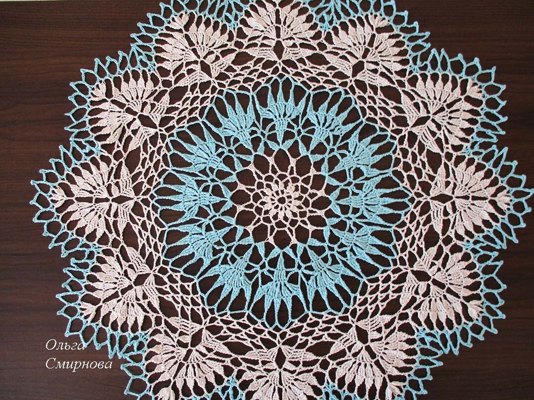Рядов тут всего 15, но они довольно высокие - с 2-мя и 3-мя накидами столбики, да еще на ножках, поэтому получается красивый ажур и размер не маленький - 47 см в диаметре.