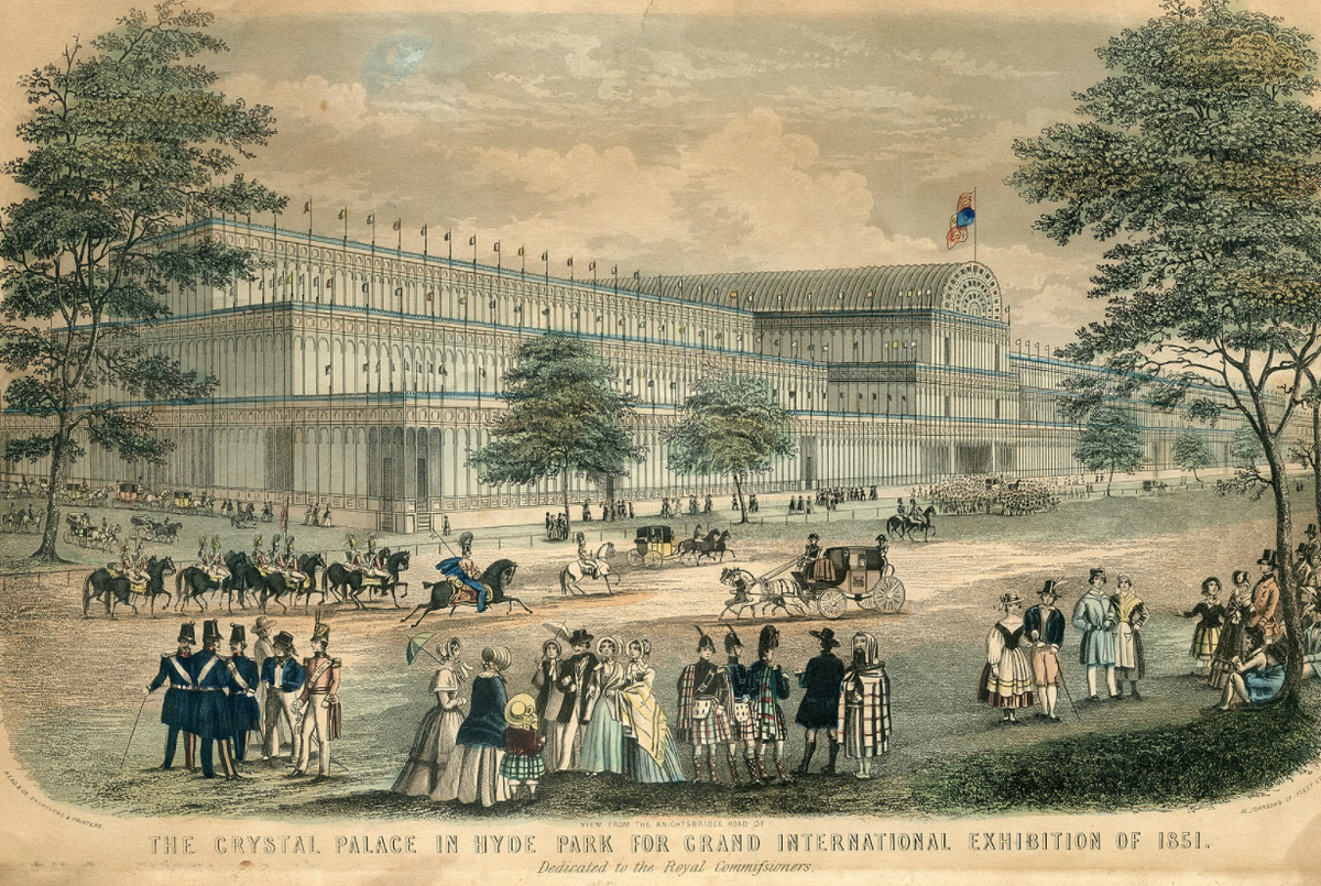 Первая международная выставка прошла в 1851 году в Лондоне. Она была промышленной и посетило ее более 6 миллионов человек из 32 государств. Так начался культурно-технический обмен между странами. Специально к этому событию в Гайд-парке построили Хрустальный дворец. На этой выставке гости со всего мира впервые попробовали сгущенку, увидели швейную машинку «Зингер» и знаменитые русские бриллианты. Россия презентовала 365 экспонатов: зерно, хлопок, кожу, изделия металлургической промышленности и предметы роскоши. Злаки и травы получили Медаль второй степени, особенно жюри выделило гречневую и манную крупы. Крепостное хозяйство страны на тот момент находилось в кризисе, поэтому помещиков, купцов и фабрикантов, которые пожелали бы принять участие в выставке, было откровенно мало. Большой медалью наградили ювелирную фирму Павла Сазикова за канделябр с сюжетами Куликовской битвы и придворных ювелиров Камера и Зефтигена — за бриллиантовую диадему. Фабрика малахитовых изделий Демидовых п