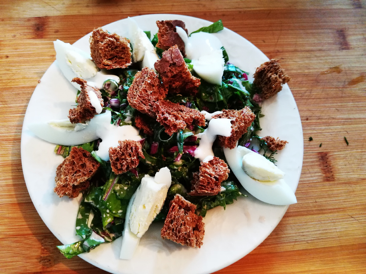 Летние витамины использую по максимуму. Получается очень вкусный зеленый салат, свекольные листочки очень нежные. Как говорят умудренные опытом и профессионализмом повара: « Все в этом мире можно приготовить, а если не вкусно, значит надо это просто научиться готовить». Всем привет подписчикам канала Готовим дома с любовью. Делюсь еще одним простым и доступным рецептом витаминного, летнего салата. Прекрасно, конечно же, если под окном растёт свеколка. Так же знаю, что очень многие просто выбрасывают ботву, выбросить можно все. Я вообще сторонник того, что в хозяйстве все пригодиться. Стараюсь всё пускать в переработку. Ингредиенты: Большой пучок молодых листьев свеклы 1 пучок – зеленый лук 1 пучок – укроп 1 пучок – листьев салата 1 пучок – листьев рукколы Домашний майонез или майонезный соус Отварное яйцо по количеству порций Сухарики домашние ржаные – 30-40 грамм на одну порцию Приготовление: Первым делом найти свежие молодые листья свеклы. Если все это есть, приступаю к сборке салата