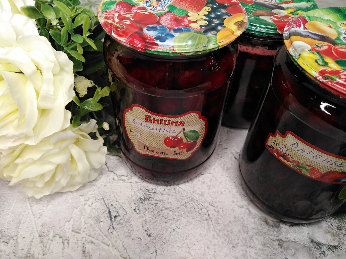 Из двух килограммов вишни и одного килограмма сахара у меня получились две баночки варенья по 670 миллилитров и одна баночка объемом 500 миллилитров.