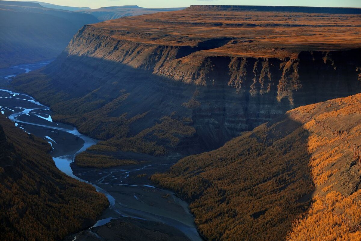 Плато не сразу стало таким, каким мы видим его сейчас. Оно долгое время, под воздействием тектонических процессов поднималось, и потом стало растрескиваться, а вода довершала свое дело. В результате этого появились чудесные каньоны и красивейшие виды. Но климат здесь суровый, ведь рядом проходит Северный полярный круг, и в зимнее время в этом месте ужасно холодно.