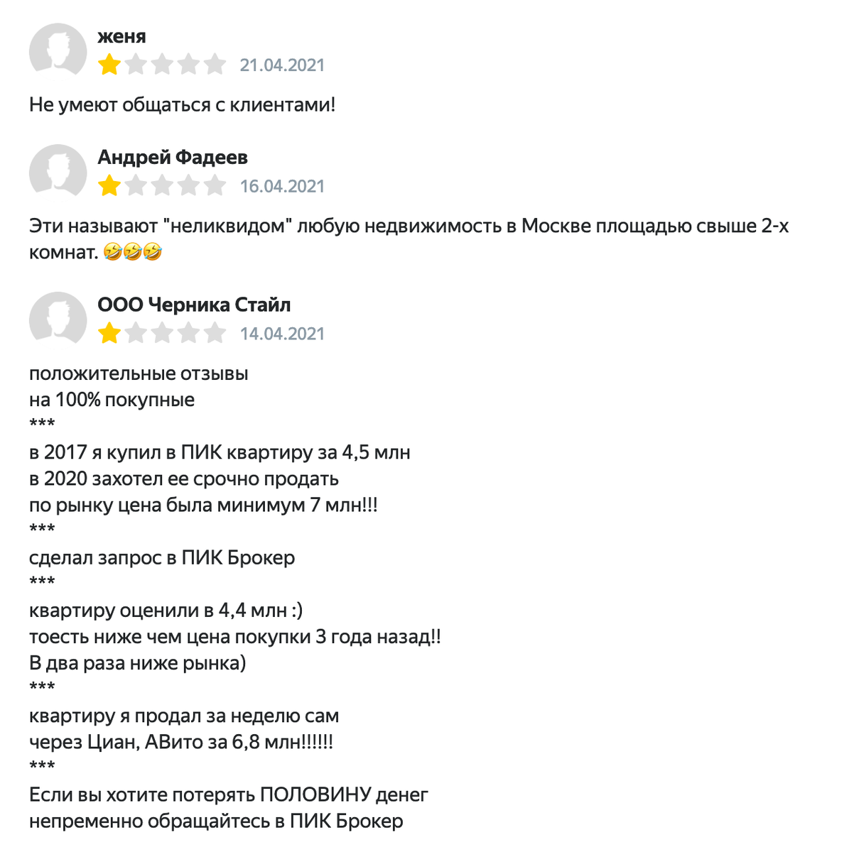 Давно планировала разместить свои мысли на эту тему. И из-за занятости затянула. Ну да ладно Почему я захотела это написать. Всё просто. Мне надоела дурацкая реклама ПИКа о том как продавать квартиру. Помните смайлики? И самый счастливый был при выборе ПИКа, конечно. Только вот отзывы на эту компанию этого не доказывают, наоборот. Показывают, что с ними как раз и ... :((( Но почему-то Я.У ставили его выше всех. Я понимаю, что «миром правит серебро» и что деньги всё решают, только для чего говорить (звонок из службы поддержки) «мы заботимся о качестве и поэтому ставим выше в списке тех, кто лучше работает. В итоге ставят тех, кто больше платит, не заботясь о качестве. Скрины отзывов прилагаю. Да вы и сами сможете почитать, всё в открытом доступе. Да, своё несогласие вылила сюда. Потому что нет у меня миллионов на рекламу, нет у меня связей в правительстве, чтобы массово запустить свой высокий уровень качества предоставления в массы. Делаю всё по шагам. Маленьким и порой не регулярн
