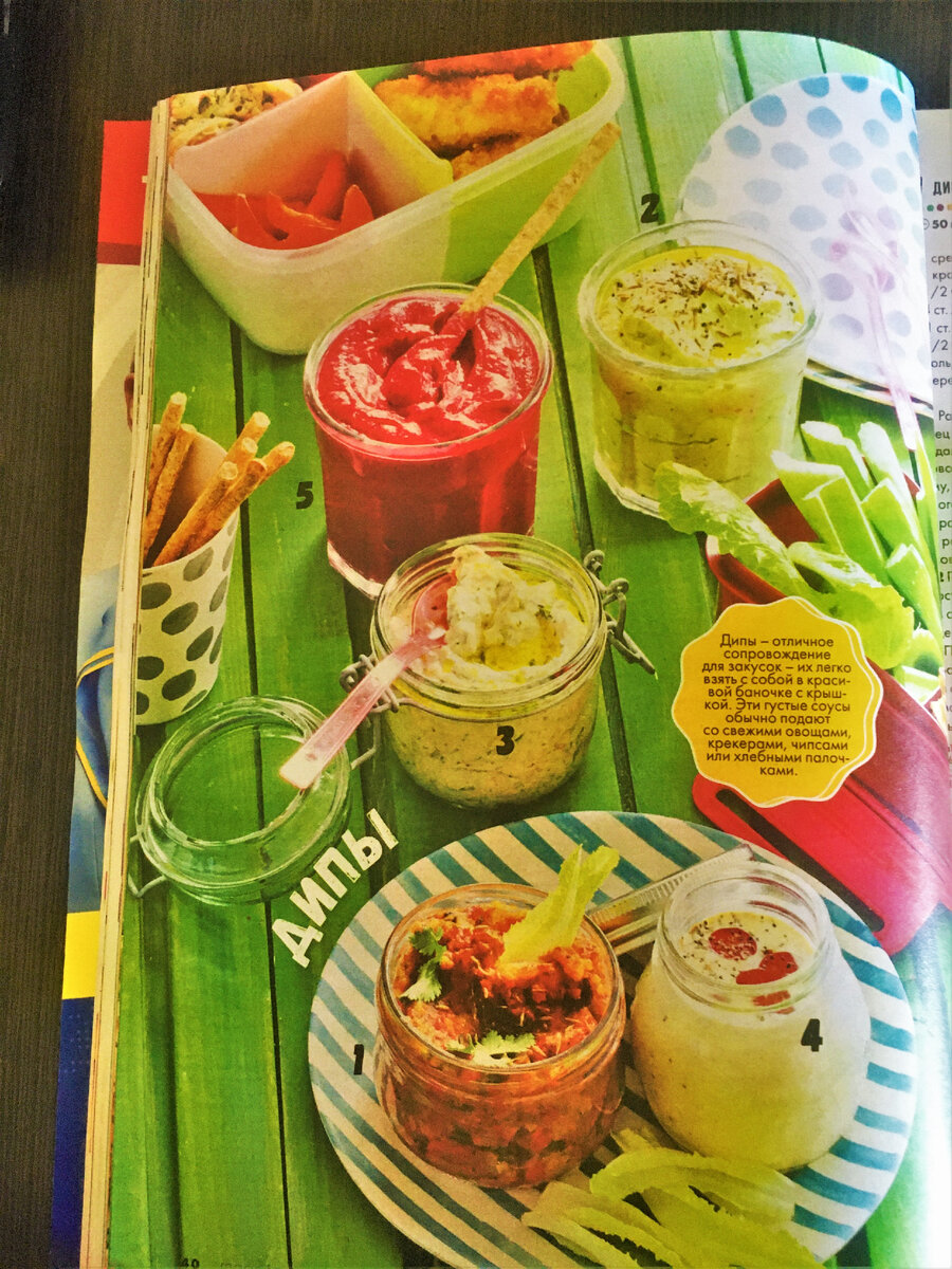 Вот мы и добрались до 3 части, в ней я собрал список дипов всё также, с составом и способом приготовления. Кто не знает, дипы - это отличное сопровождение для закусок - их легко взять с собой в красивой баночке с крышкой. Эти густые соусы обычно подают со свежими овощами, крекерами, чипсами или хлебными палочками. 1 ДИП С БАКЛАЖАНОМ 50 мин 5 порции ингредиенты : Способ приготовления : На 100 г. 2 ДИП С АВОКАДО 10 мин 5 порций Ингредиенты : Способ приготовления : На 100 г. 3 ДИП СО СЛИВОЧНЫМ СЫРОМ 10 мин 5 порций Ингредиенты : Способ приготовления : На 100 г. 4 ОСТРЫЙ ДИП С КАРРИ 5 мин 5 порций Ингредиенты : Способ приготовления : На 100 г. 5 СВЕКОЛЬНЫЙ ХУМУС 1 ч + 8 ч 5 порций