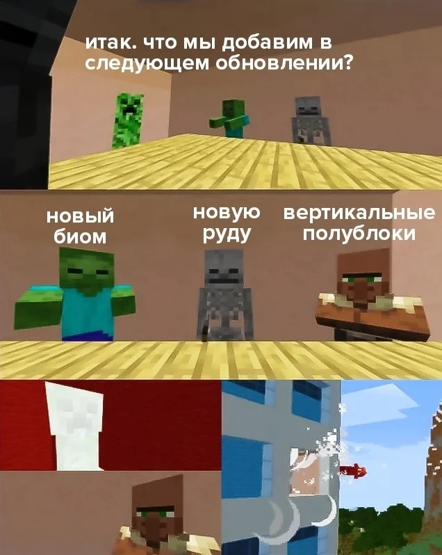 Всем привет! С вами снова блок майнкрафта и сейчас вы увидите ещё один десяток мемов по майнкрафту! Поехали! Крипер видимо согласился со скелетом(если они думали над релизом 1.17). Я если честно ничего не понял Если за мной гонится алмазник,я сразу пишу админу,либо же ударяю его рукой и выхожу с сервера O no!O no!O no no no no no!! Полностью согласен! Без комментариев И снова без комментариев Перевод: Время идти!Я был хорошей игрой?Стоп...Подожди-ка...Прости,ошибся игрой. 🤣🤣🤣🤣🤣🤣🤣😂🤣🤣 Жизненно! Снова и снова без комментариев. Ну не... Кварц это нужная вещь! Например для постройки хайтек дома! Согласен! У него такие цены!!! А я думал что они думают что мы работаем на них!Они же такую мелочь предлагают за нужные вещи!А они ещё возмущаются! Тупой пиглин! Ну на этом все! С вами был Блок_майнкрафта и всем пока!
