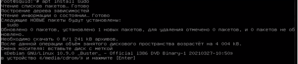 В предыдущей части мы устанавливали ОС Debian https://zen.yandex.ru/media/id/60e1d8d706f073705f93e6e0/nastroika-i-ustanovka-squid-na-debian-109-s-kerberosautentifikaciei-chast-1-ustanovka-debian-60eaa0b42fdcb104b1275ac1 Теперь же нам нужно будет установить squid и некоторые вспомогательные программы. Итак,приступим: возвращаемся к нашей машине с установленной системой. Логинимся под рутом. Первые две задачи, которые нам нужно решить: 1) Установить утилиту sudo. Делается это для того, чтобы у обычного пользователя были при использовании этой команды права админа при запуске команды, которая эти права требует. Ну и чтобы по ssh можно было подключиться. 2)Добавить нерутового пользователя в группы sudo и ssh, то есть для запуска программ, требующих прав администратора и для подключения по ssh соответственно. для установки sudo вбиваем следующую команду: apt install sudo apt - это менеджер пакетов в линукс, при помощи него можно скачивать и сразу устанавливать программы с репозиториев (зе