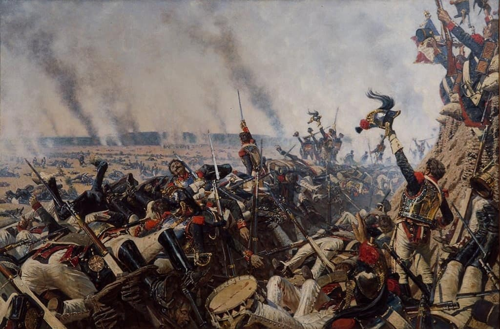 Вот он – печальный итог «битвы гигантов». На переднем плане – солдаты армии Бонапарта. Они взывают к своему командиру, поднимая вверх руки, знамена и шлемы. Во рву, у недавно занятой русской батареи, - горы трупов. Среди них есть раненые, с залитыми кровью лицами, искаженными гримасами от нестерпимой боли. Эти кричащие от ужаса смерти рты, окровавленные грязные одежды – как наглядный упрек Наполеону за вторжение. Очевидно, что создатель целого цикла-посвящения 1812 году Василий Васильевич Верещагин к войне относился как к всемирному злу, что и хотел показать в своих работах. Кажущийся хаотичным линейный ритм и пестрота колористического решения картины имеют определенный смысл. Фигуры приветствующих Наполеона солдат глубоко трагичны. Их неудержимое, еще не иссякшее стремление принести победу прославленному полководцу, выглядит неубедительно. Огромные жертвы, принесенные ради удовлетворения ч