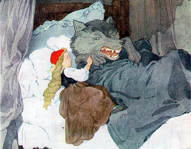 Знакомая всем с детства сказка заканчивается тем, что Красную шапочку и бабушку спасли дровосеки. Оригинальная французская версия (Шарля Перро) была далеко не так мила. Убив бабушку, волк не просто ее съедает, а готовит из ее тела блюдо, а из крови — некий напиток. Спрятавшись в кровати, он наблюдает, так Красная Шапочка с аппетитом уплетает свою же бабушку. Предупредить девочку пытается бабушкина кошка, но и она умирает страшной смертью (волк бросает в нее тяжелые деревянные башмаки). Красную Шапочку это, по-видимому, не смущает, и после сытного обеда она послушно раздевается и ложится в кровать, где ее поджидает волк. И всё. Никаких дровосеков, никакой бабушки – только довольный сытый волк и Красная шапочка, которую он загрыз. Впоследствии Шарль Перро сочинил для этой истории оптимистичный финал и добавил мораль для всех, кого всякие незнакомцы зазывают к себе в кровать.
