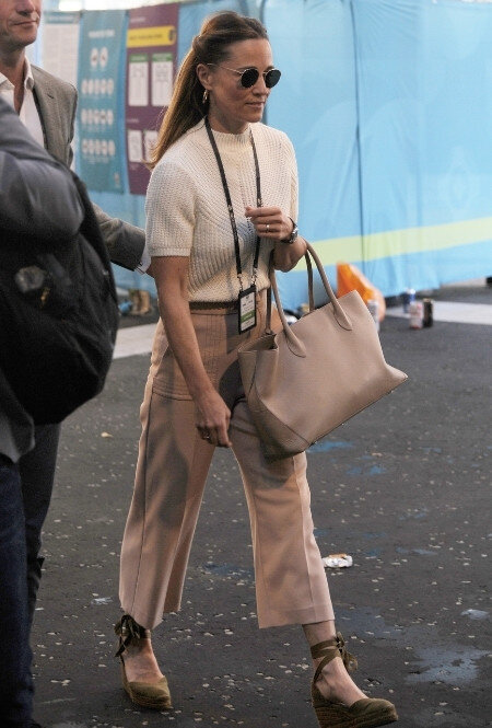 Прошедший на днях в Лондоне матч Дания-Англия собрал на трибунах весь сок светских кругов двух стран — в том числе представителей королевских семей. В стороне от исторического матча не смогли остаться и близкие Кейт Миддлтон, ее младшая сестра Пиппа с супругом Джеймсом Мэттьюсом. Пара вместе с другими членами БКС пришла поддержать национальную сборную, однако Кейт в этом году не смогла составить компанию принцу Уильяму из-за контакта с зараженным COVID-19. Для светского выхода Пиппа примерила лаконичный аутфит в кофейных оттенках в любимом casual-стиле. Младшая Миддлтон выгуляла комбинацию с укороченными брюками, трикотажной кофтой с короткими рукавами и эспадрильями на танкетке, которую дополнили сумка-тоут в тон низа и круглые солнцезащитные очки. Текст: MarieClaire.ru