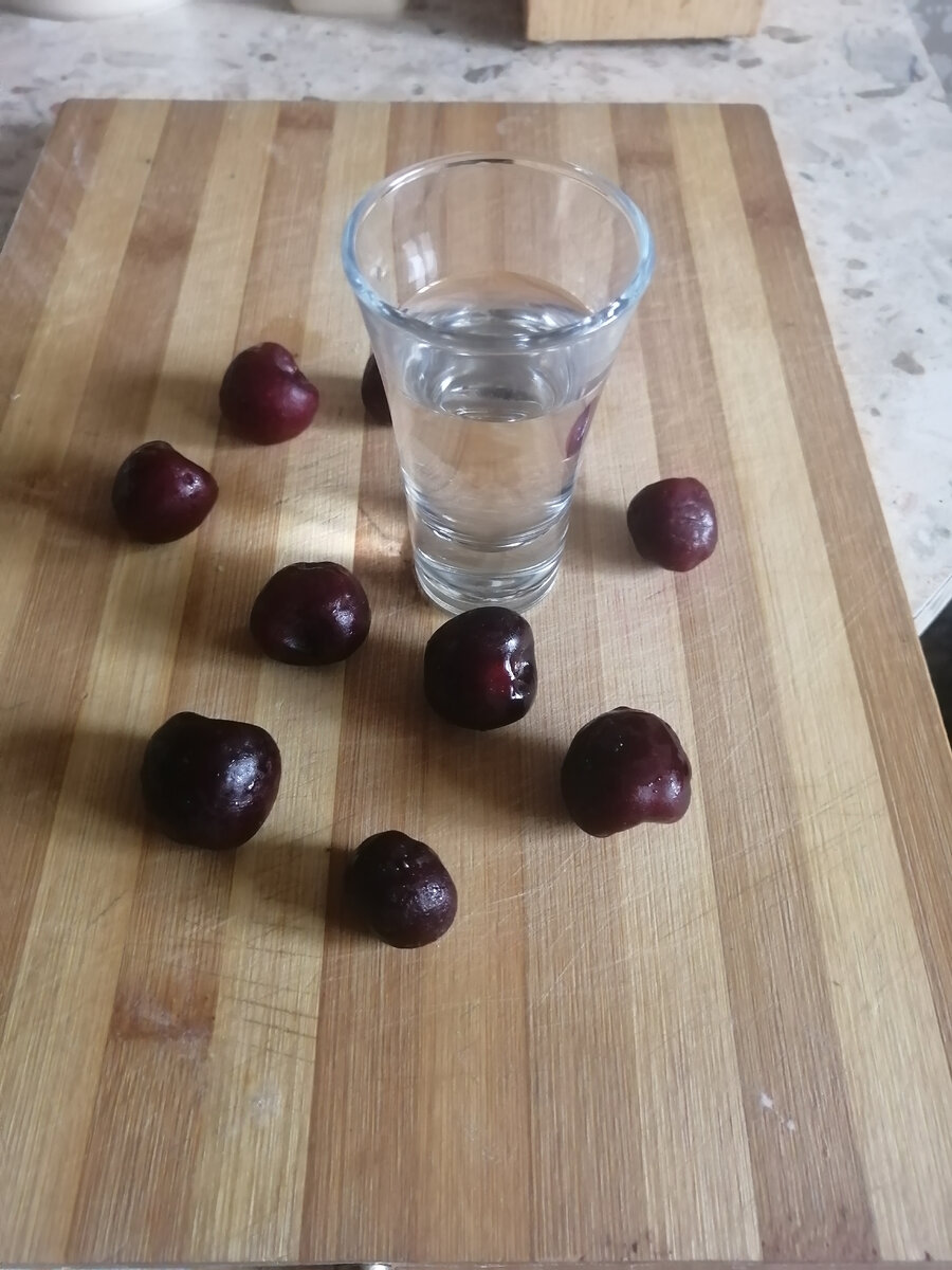 Здравствуйте друзья. С вами Самогон ТВ. Сегодня я расскажу как приготовить отличный напиток на основе виноградного дистиллята и черешни. Такое сочетание и вообще этот рецепт мне подсказал один товарищ Способ приготовления довольно простой: Нужно в спирт-сырец, полученный при первом перегоне виноградной браги добавить ягоды черешни. Что касается пропорций, тут всё делается по вкусу и принципу кашу маслом не испортишь, но на 5 литров сырца не менее 0,5 килограмма черешни. Важно перед закладыванием ягод проткнуть их чем то острым, например вилкой. Разрушать их не стоит, но проколоть нужно, так ягоды быстрее отдадут свои вкусовые и ароматические качества. Банку с настойкой сырца и черешни убрать на неделю настаиваться иногда встряхивая. Спустя неделю произвести дробный перегон по всем правилам дистилляции фруктовых напитков. Дать готовому продукту отстояться после перегона несколько дней и можно употреблять. Напиток получается очень ароматным и приятным на вкус. Стоит