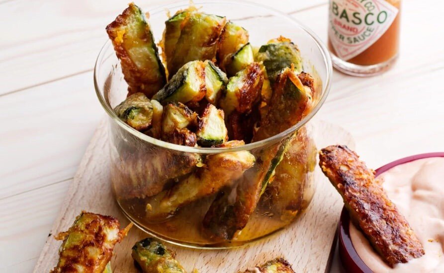 Кабачок обжаренный с пряным томатным майонезом Ингредиенты на 4 порции: 🔹900 г Цукини 🔹110 г Миндальной муки 🔹225 мл Сыра пармезан 🔹1 ч. л. Лукового порошка 🔹0.5 ч. л. Молотого черного перца 🔹2 шт Яиц 🔹3 ст. л. Оливкового масла ПРЯНЫЙ ТОМАТНЫЙ МАЙОНЕЗ 🔹225 мл кето майонеза 🔹1 ч. л. Томатной пасты 🔹0.5 ч. л. Табаско или кайенский перец 🔹Соль и перец по вкусу Приготовление: 1️ Смешайте ингредиенты для томатного майонеза и поставьте в холодильник. 2️ Разогрейте духовку до 200°C. Застелите противень пергаментной бумагой. 3️ В небольшой миске взбейте яйца до однородной массы. 4️ В другой миске смешайте миндальную муку, пармезан и специи. 5️ Нарежьте кабачки крупной соломкой. Удалите семена (или оставьте, если хотите). 6️ Тщательно обваляйте кабачки в смеси сыра и миндальной муки. Затем поместите в яичную смесь, после чего снова в муку. 7️ Выложите кабачки на противень и сбрызните оливковым маслом. Выпекайте в предварительно разогретой духовке приблизительно 20-25 минут или до апп