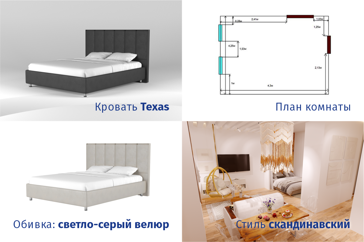 Помните нашу игру в сторис Instagram? Вы сами путём голосования выбирали мебель, цвета и стиль интерьера для нового проекта. Это была отличная командная работа! Вот, что у нас получилось. Вы выбрали комнату традиционной прямоугольной формы площадью 17,5 м2 и скандинавский стиль интерьера. У вас прекрасный вкус! А мы решили представить сразу 3 варианта оформления. 1 Вариант – Стандартная расстановка. В центре спальни стоит кровать, которая победила в голосовании – Strong Texas светло-серого цвета. Напротив зона отдыха с удобным креслом и скамьёй. Кстати, на подоконниках тоже можно отдыхать, так что они стали изюминкой проекта. В качестве декора использовали текстиль и живые растения. Для хранения вещей предусмотрели единственный шкаф, так что комната осталась просторной и светлой. 2 Вариант – Планировка с углублённой зональностью. Здесь мы решили поставить перегородку, чтобы разделить спальню и систему хранения. Кровать стоит по фен-шую напротив окна, чтобы обеспечить максимальное пог